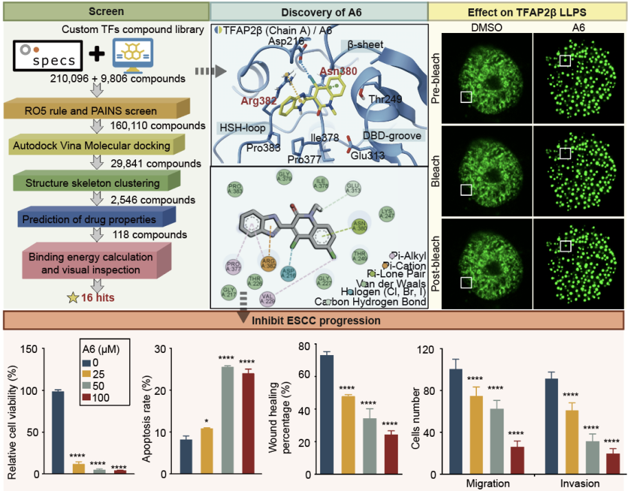 在明确TFAP2β相分离行为可作为食管鳞癌干预靶点的基础上,团队进一步建立了独有的靶向相分离干预小分子的虚拟筛选与实验验证体系,获得特异性促进TFAP2β相分离行为的小分子化合物A6。