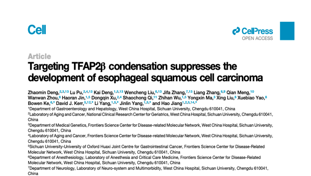 近日,四川大学华西医院消化内科、消化系统肿瘤与肝病研究室、四川大学-牛津大学华西消化道肿瘤联合研究中心姜昊教授、杨锦林教授、杨丽教授联合英国牛津大学DavidJ. Kerr教授和华西医院麻醉学研究所柯博文研究员,在国际顶级学术期刊《Cell》上发表题为“Targeting TFAP2β condensation suppresses the development of esophageal squamous cell carcinoma”的研究论文。该研究利用多组学联合分析,首次发现食管鳞状细胞癌治疗新靶点TFAP2β,并开发出全球首个以相分离为作用机制、直接靶向TFAP2β相分离行为与功能的小分子化合物A6,突破了食管鳞癌治疗无特异性靶向药物的临床瓶颈,具有重大的科学意义与临床应用前景。该研究亦是四川大学华西医院与牛津大学自2018年始密切合作的标志性成果。