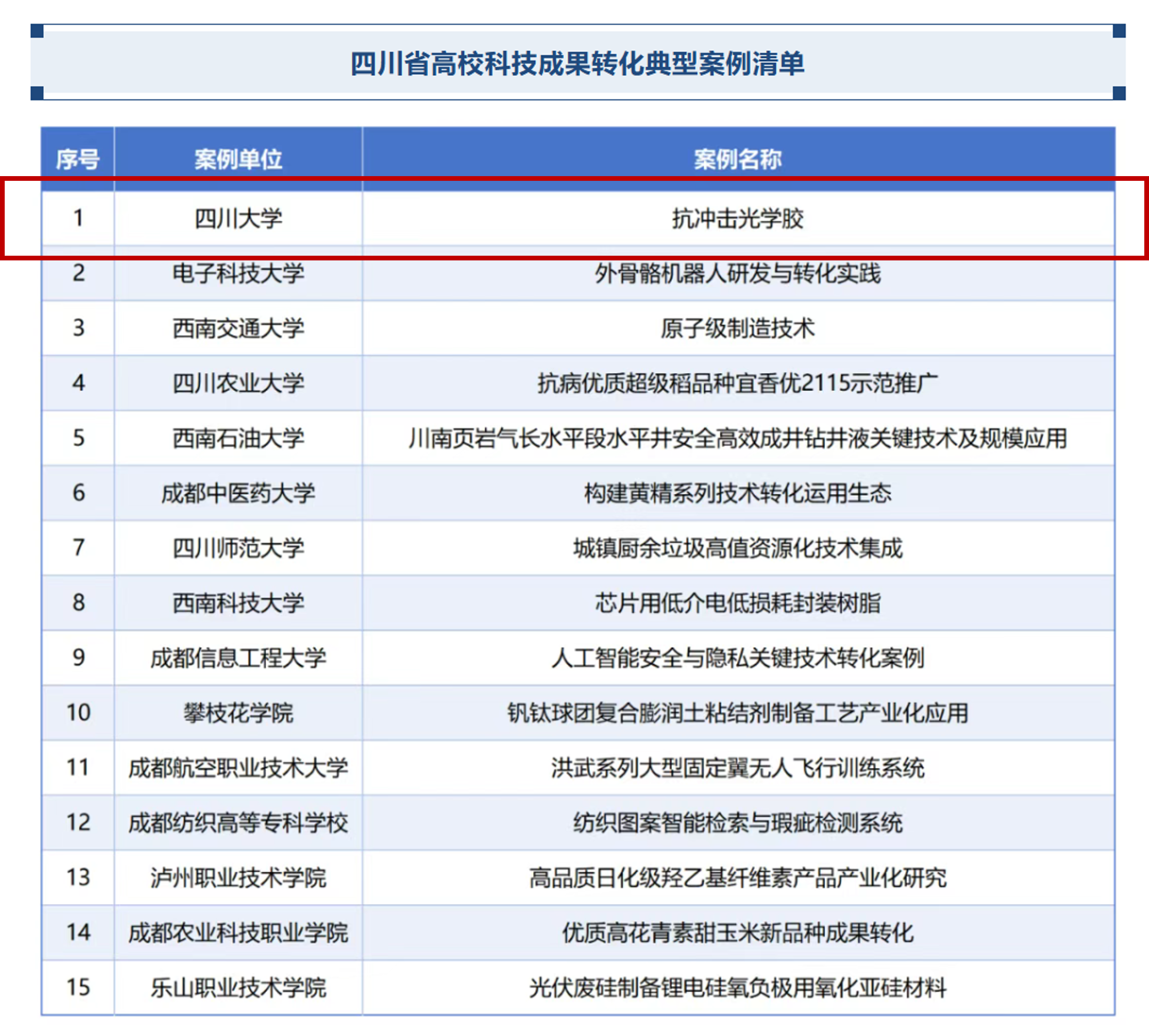 12月22日下午,第四届成渝地区高校科技成果转化大会在成都召开,会上,四川省教育厅发布了《四川省高校成果转化典型案例》,我校高分子科学与工程学院吴锦荣教授团队研发的“抗冲击光学胶”成功入选15个典型案例之一。