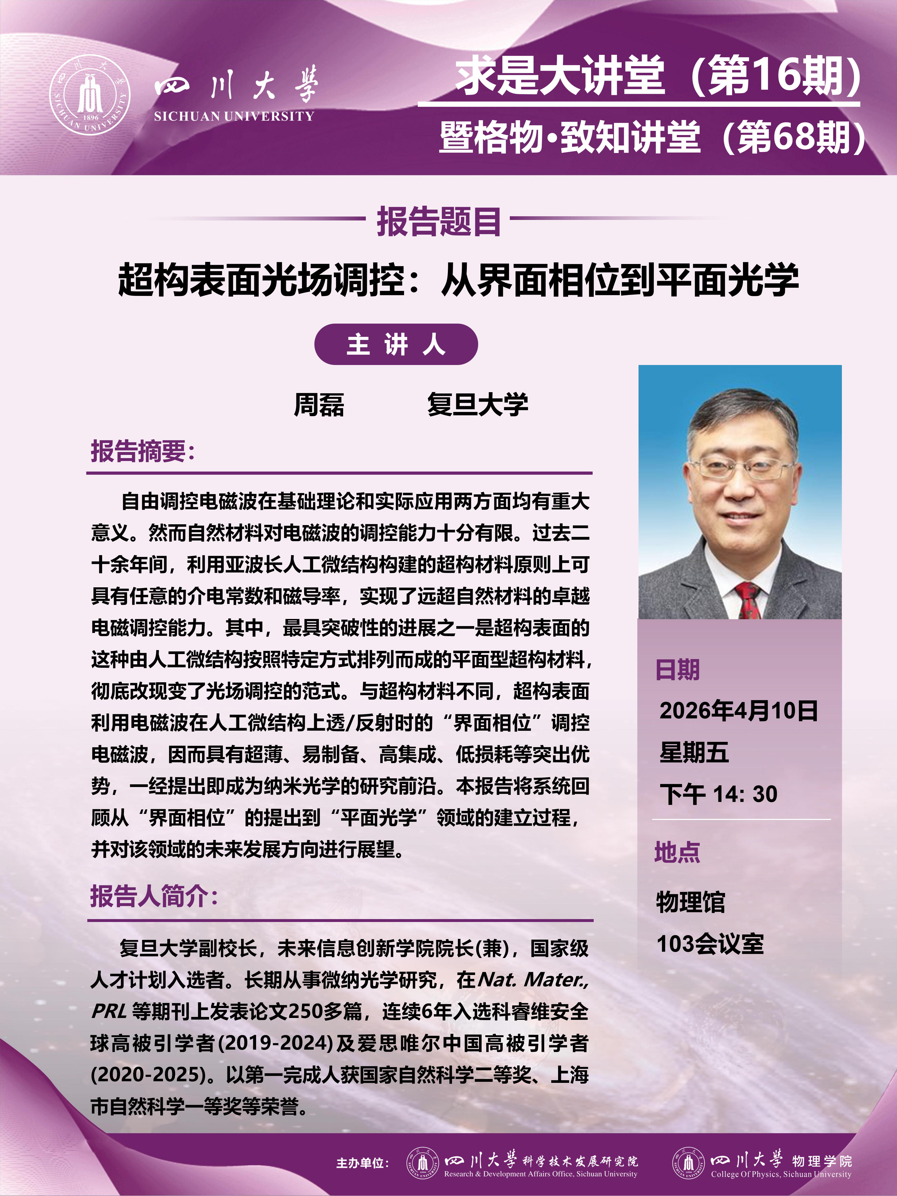 四川大学求是大讲堂(第16期)— 超构表面光场调控:从界面相位到平面光学