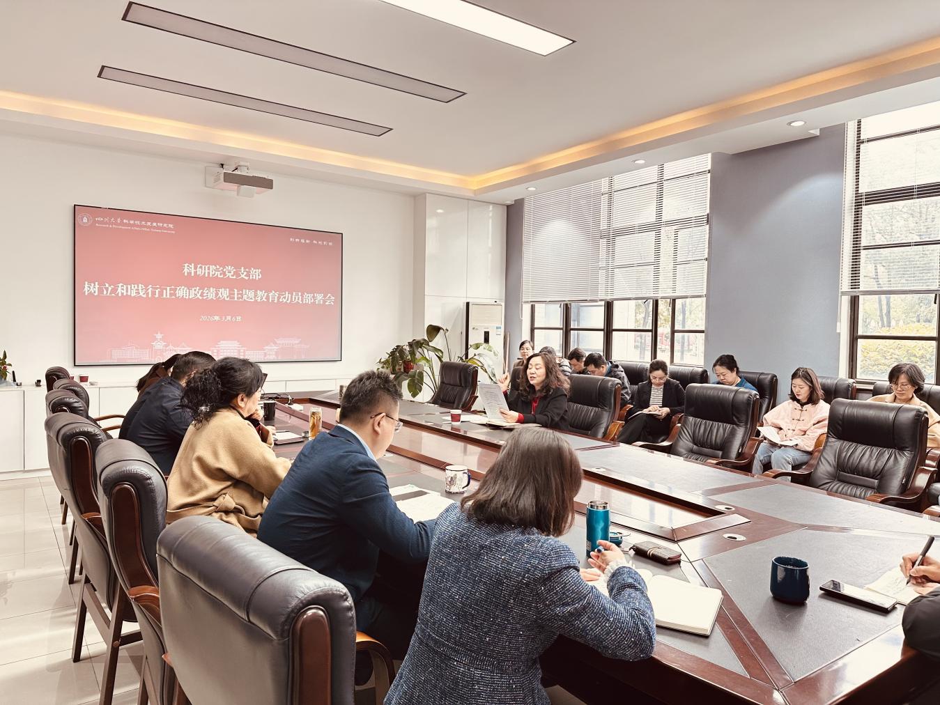 2026年3月6日,科研院党支部于望江校区行政楼223 - 1会议室召开树立和践行正确政绩观主题教育动员部署暨2026年度新学期工作布置会议。科研院全体教职工参 加 了此次会议。党支部书记、 院长 吴尧同志主持会议并发表讲话。