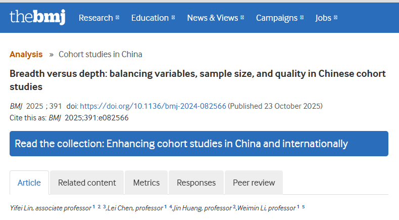 近日,我校华西医院呼吸和共病研究院院长李为民教授联合医工结合创新转化中心主任黄进教授,高原医学研究院副院长、神经疾病研究所副所长陈蕾教授团队在医学顶级期刊《英国医学杂志》(the BMJ)发表以“Breadth versus depth: balancing variables, sample size, and quality in Chinese cohort studies”为题的分析性文章(Analysis),首次从实证出发揭示了当前中国大规模队列扩张中变量广度、样本量深度与研究质量之间的结构性失衡,并提出价值驱动的系统性解决方案。李为民教授、黄进教授、陈蕾教授为通讯作者;健康数据科学研究室主任林逸飞副研究员为第一作者。该文章被收录在BMJ“推进中国及国际队列研究”专辑中,也是该专辑中唯一一篇作者为全临床医生的研究文章。