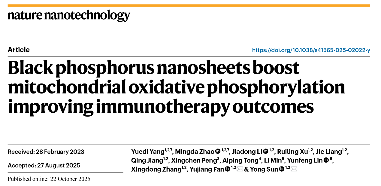 10月22日,我校生物医学工程学院/国家生物医学材料工程技术研究中心樊渝江教授和孙勇研究员在Nature Nanotechnology上发表题为“Black phosphorus nanosheets boost mitochondrial oxidative phosphorylation improving immunotherapy outcomes”的研究论文,揭示黑磷纳米片通过大幅增强线粒体氧化磷酸化逆转肿瘤细胞固有的糖酵解代谢方式,抑制肿瘤增殖的同时激活免疫,为肿瘤免疫治疗带来新思路。