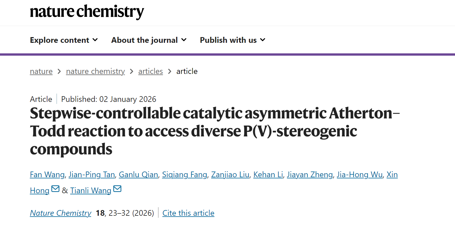 近日,我校化学学院王天利教授团队与浙江大学洪鑫教授团队(理论计算)合作,揭示了利用仿生手性肽-季鏻盐(PPS)催化剂实现的催化直接不对称Atherton–Todd反应。该研究以“Stepwise-controllable catalytic asymmetric Atherton–Todd reaction to access diverse P(V)-stereogenic compounds”为题目发表在Nature Chemistry上,并被选为该期刊2026卷首封面。四川大学为第一通讯单位,我校化学学院王天利教授为通讯作者,浙江大学洪鑫教授为共同通讯作者。四川大学2023级博士生王帆、湖南工程学院谭建平教授与浙江大学博士生钱甘露为共同第一作者。